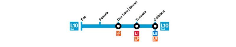 La línea de metro L10 Sur está formada por 5 estaciones situadas en varias zonas de l’Hospitalet de Llobregat. Como hemos dicho anteriormente, el objetivo en los próximos años será juntar este tramo con el tramo Norte para hacer una línea que atraviese toda Barcelona hasta llegar al municipio de Sant Adrià del Besòs.
