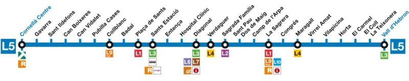 Con esta línea nos vamos al otro lado del mapa que habíamos visto hasta ahora: la L5 cubre los municipios de Cornellà de Llobregat, L’Hospitalet de Llobregat, Esplugues de Llobregat y Barcelona.