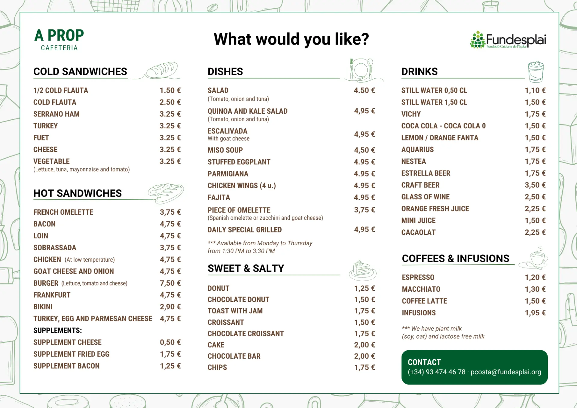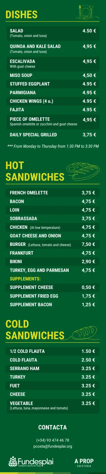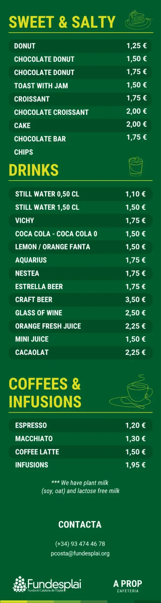 Die Cafeteria A prop ist ein Ort, der zum Verweilen einlädt. Sie befindet sich neben dem Mehrzweckraum des Centre Esplai und bietet eine sorgfältige Auswahl an Sandwiches, raffinierten Gerichten, Süßigkeiten, Snacks, Getränken, Kaffee und Aufgüssen.