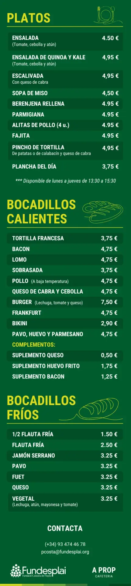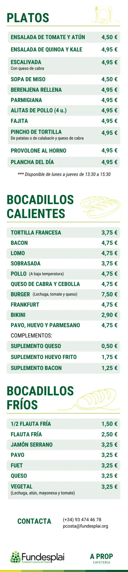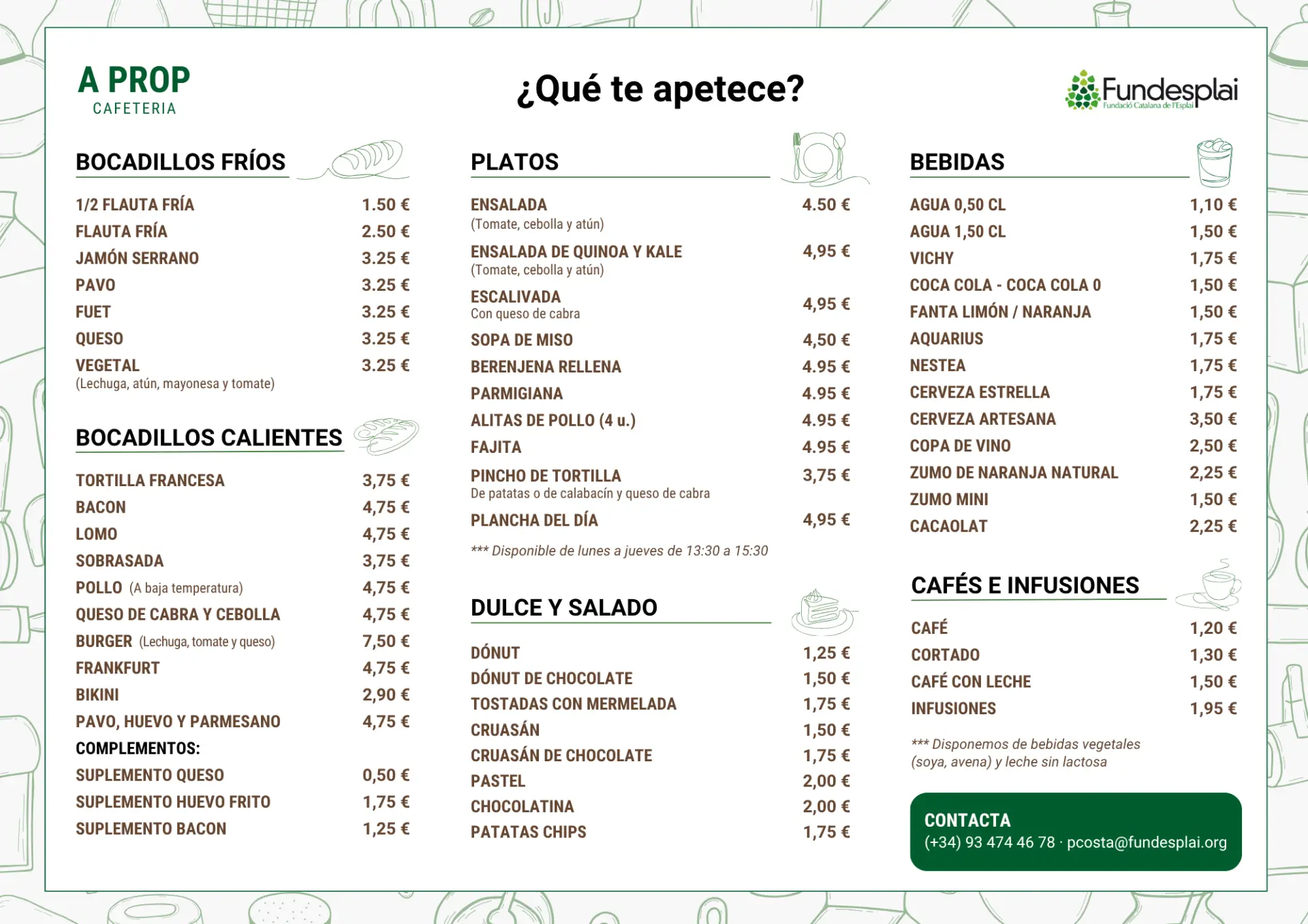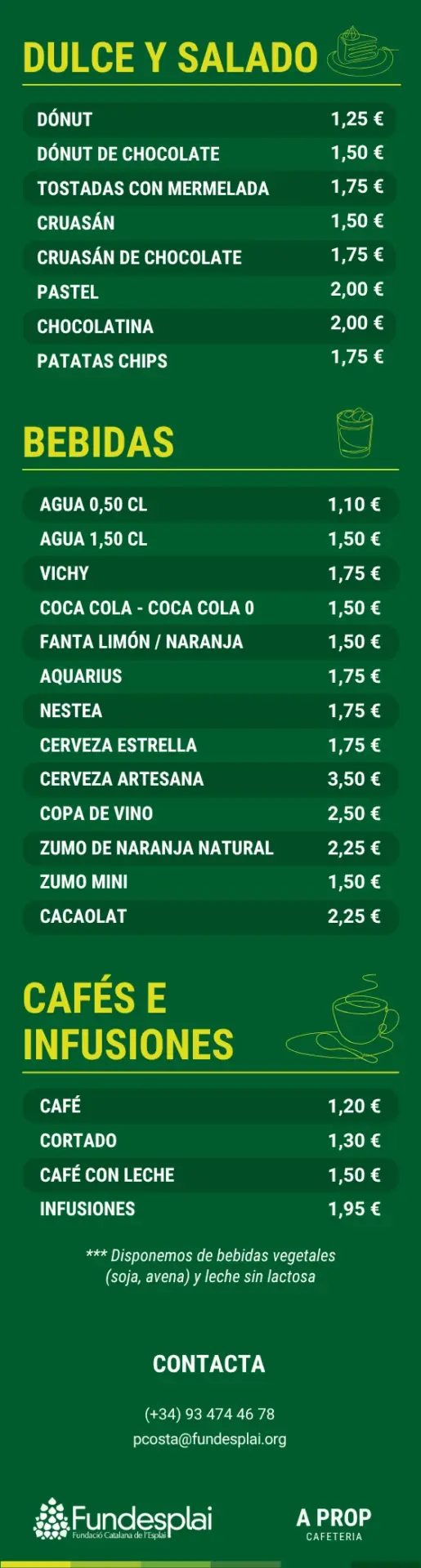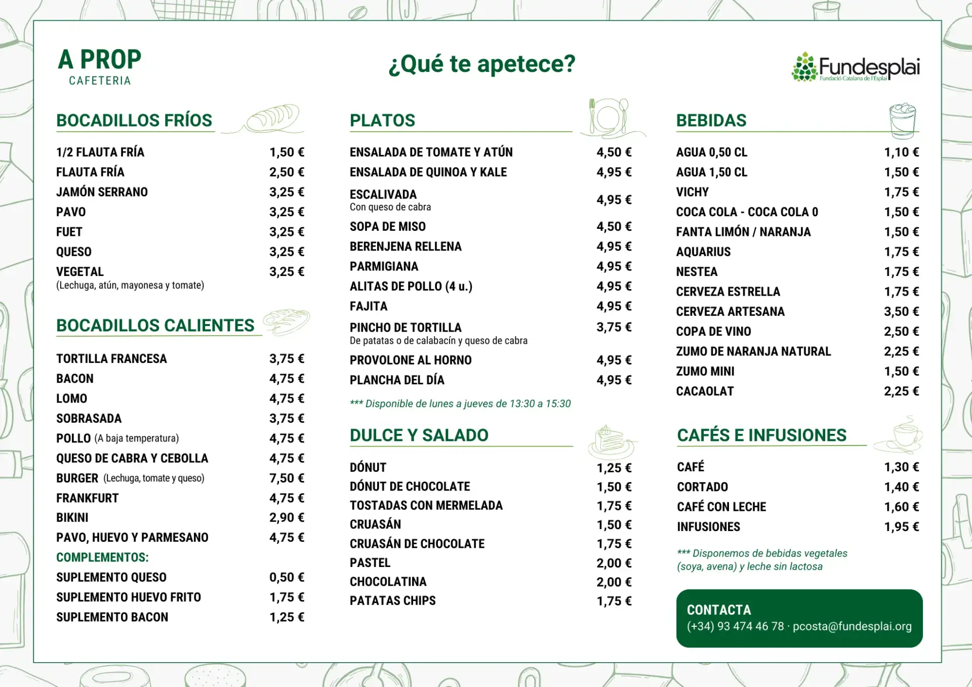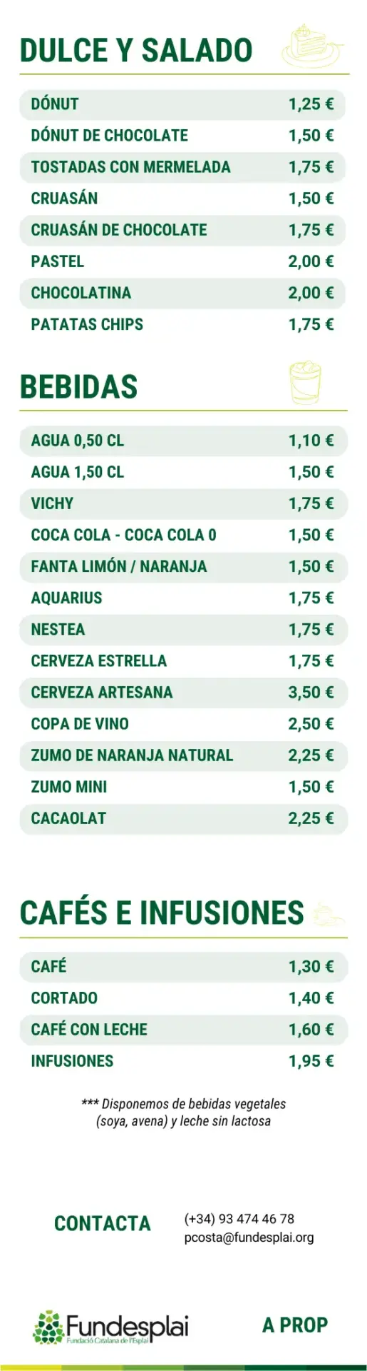 La cafetería A prop es un espacio que te invita a quedarte. Situada junto al espacio polivalente de Centre Esplai, ofrece una cuidada selección de bocadillos, platos elaborados, opciones dulces, aperitivos, bebidas, cafés e infusiones.