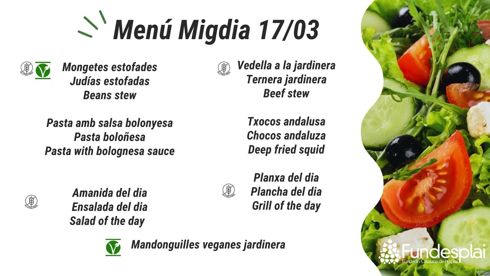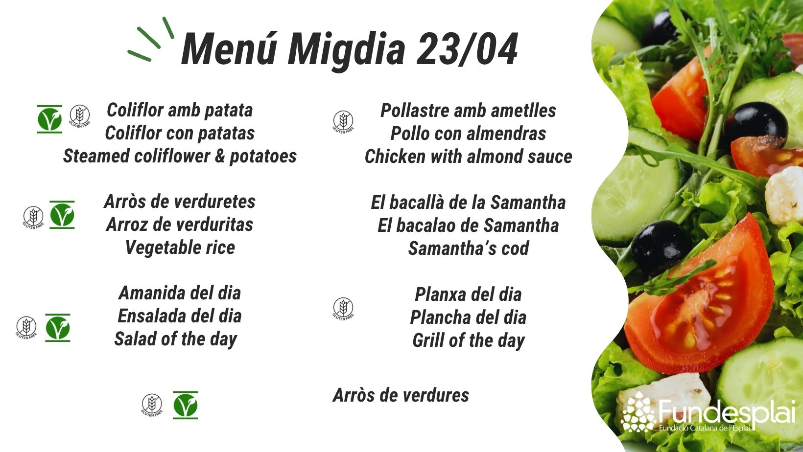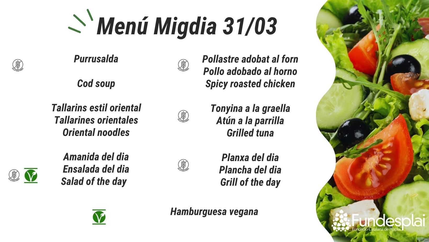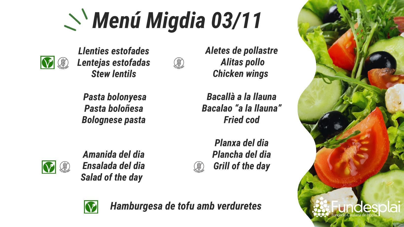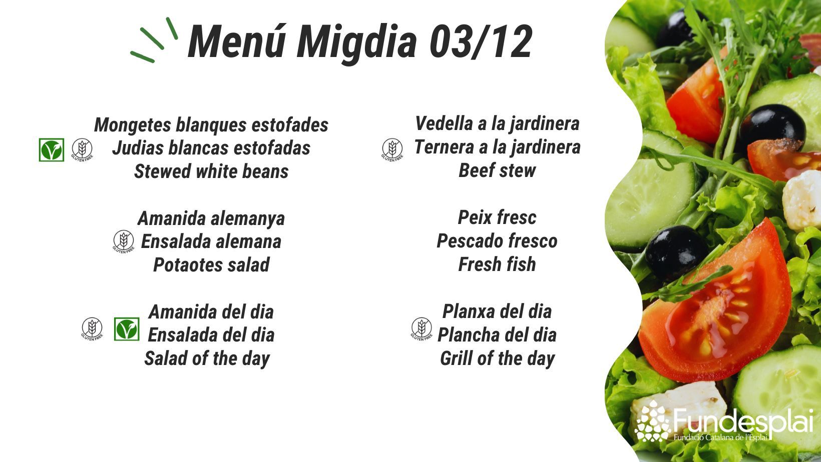 ¿Quieres probar estos platos deliciosos elaborados con productos de temporada? Ven a nuestro restaurante Tasta’m, ubicado en Centre Esplai, y disfrutarás de un bufé al mediodía con todas estas opciones. ¡No te lo pierdas!
