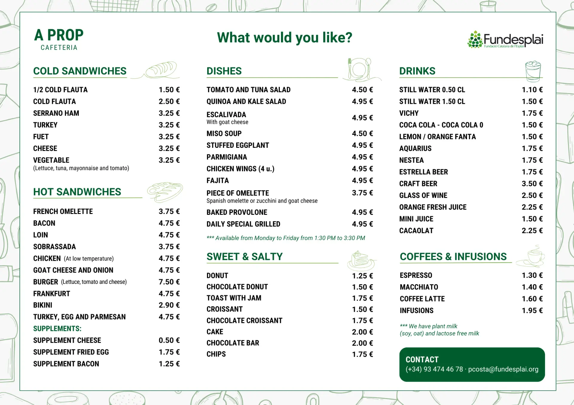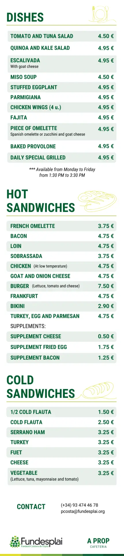 La cafétéria A prop est un espace qui invite à la détente. Située à côté de l’ espace polyvalent du Centre Esplai, propose une sélection soignée de sandwichs, de plats élaborés, de douceurs, de snacks, de boissons, de cafés et d’infusions.